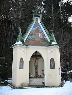Die Lourdeskapelle am westlichen Ende des Friedhofs wurde von der Familie Kremser gestiftet und 1884 geweiht. Der neugotische Bau weist ein steiles Satteldach und spitzbogige Tür- und Fensteröffnungen auf. Im tonnengewölbten Inneren befindet sich hinter einem barockisierenden Schmiedeeisengitter mit bekrönendem Marienmonogramm eine Lourdesgrotte.[10][11]