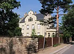 Das zweigeschossige, mitsamt der Einfriedung unter Denkmalschutz[1] stehende Landhaus liegt auf einem Eckgrundstück zur Nizzastraße.