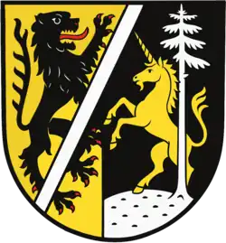 Das Wappen, das der Landkreis aufgrund ministerieller Genehmigung vom 15. Juni 1962 bis zu seiner Auflösung im Jahr 1972 führte, ist von Gold nach Schwarz gespalten. In der rechten Schildhälfte einen linksgewendeten, schwarzen, rot bewehrten Löwen mit einer silbenern Schräglinksleiste überdeckt, in der linken Schildhälfte auf silbernem Boden ein goldenes Einhorn, das hinter einem silbernen Nadelbaum hervorspringt.