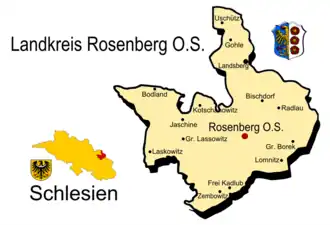 Im Fürstentum Oppeln, einem der schlesischen Teilfürstentümer, wurden aus den alten schlesischen Weichbildern preußische Kreise gebildet, darunter auch der Kreis Rosenberg.[3] Als erster Landrat des Kreises Rosenberg wurde Carl Friedrich von Blacha eingesetzt.[4] Der Kreis unterstand zunächst der Kriegs- und Domänenkammer Breslau und wurde im Zuge der Stein-Hardenbergischen Reformen dem Regierungsbezirk Oppeln der Provinz Schlesien zugeordnet.[5]