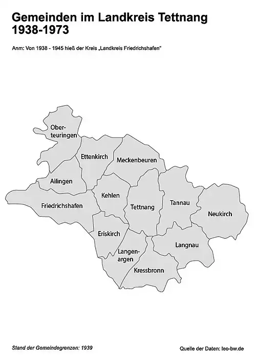 Zum Landkreis Tettnang gehörten ab 1938 zunächst 13 Gemeinden, davon zwei Städte.