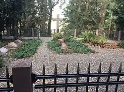Das bewaldete Landschaftsschutzgebiet Schönebusch (Position) liegt etwa 400 Meter westlich des Ritterguts Groß Vahlberg. Am Ende der südwestlichen Parkgrenze führt ein Weg zu dem kleinen Waldgebiet, der mit einer Schranke für Fahrzeuge gesperrt ist.[1] Der Schönebusch fällt stark in Richtung Norden. In dem kleinen Wäldchen befindet sich die Gedenkstätte derer von Münchhausen.[5] Um ein relativ ebenes Gedenkstättegelände zu schaffen, wurde die Stätte im Westen, Norden und Osten von Natursteinmauern eingefasst und anschließend verfüllt. Die Gedenkstätte ist umlaufend umzäunt. Sie wurde 1918 angelegt und 2016 restauriert. Im Rahmen der Maßnahmen wurde der stabile Metallzaun neu hergestellt und einzelne Posten aus Wesersandstein neu geschaffen. Die Grabinschriften sind in Findlinge eingeschlagen und weiß ausgemalt. Hinter dem Kreuz aus Wurmberg-Granit (siehe Bildmitte) öffnet sich eine Sichtachse in Richtung Norden, die einen Blick in die Landschaft ermöglicht.