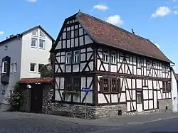 Im historischen Ortskern sind als Kulturdenkmäler etliche Hofanlagen mit Fachwerkhäusern des 18. und 19. Jahrhunderts erhalten. Die älteste Hofanlage aus dem 17. Jahrhundert steht in der Obergasse 32 und zeichnet sich durch ornamentierte Winkelbänder aus. In der Schillerstraße entstanden um 1700 das ehemalige Gasthaus „Zum kühlen Grund“ (Nr. 43) und in der Schillerstraße 57 zur gleichen Zeit ein Fachwerkwohnhaus mit rheinischen Stilelementen.[66] Die exponierte Hofanlage in Schmittgraben 2 stammt aus dem Ende des 18. Jahrhunderts. Dem großzügigen Fachwerkwohnhaus in Ecklage mit überbautem Hoftor ist ein Backhaus angeschlossen. Das Fachwerkwohnhaus Moorgasse 17, ebenfalls aus dem 18. Jahrhundert, hat Eckständer im Obergeschoss mit geschnitzten und kannelierten Viertelsäulen. Das Fachwerkdoppelwohnhaus Paradiesgärtlein ist mit der Jahreszahl 1782 bezeichnet;[67] der Vorgängerbau brannte 1690 ab. Eine Inschrift am Sturzbalken weist auf ein wundersames Ereignis des Jahres 1624 hin. Das giebelständige Fachwerkwohnhaus Obergasse 20 datiert von 1811 und hat Eckständer mit dreiviertelhohen Streben. Das mit Kerbschnittbändern verzierte Hüttenberger Hoftor in der Schillerstraße 24 ist überdacht und hat im Gefach ein Andreaskreuz, das von einer Raute durchzogen ist.[68] Um 1900 wurden mehrere Klinkerwohnhäuser nach städtischem Vorbild errichtet.