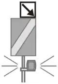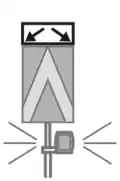 | Eine rechteckige weiße Tafel mit schwarzem Rand und einem oder zwei schwarzen Pfeilen. | Die Zusatztafel mit einfachem oder doppeltem Pfeil über einen Langsamfahrsignal, das zwischen zwei Gleisen steht, zeigt an, für welches Gleis das Signal gilt.[9] | ||