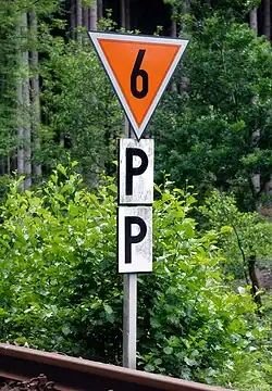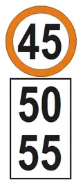 | Ankündigungssignal | Eine dreieckige gelbe Scheibe mit weißem Rand und schwarzer Ziffer. Bei beschränktem Raum kann die Dreieckspitze auch nach oben zeigen. | Ankündigung einer vorübergehenden Langsamfahrstelle, auf der die durch die Ziffer angezeigte Geschwindigkeit nicht überschritten werden darf. Die Kennziffer gibt die Höchstgeschwindigkeit mit 1/10 ihres Wertes in km/h an. | |