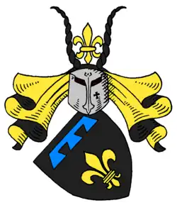 Das Wappen zeigt in Schwarz eine goldene Lilie, überhöht von einem dreilatzigen blauen Turnierkragen. Auf dem Helm mit schwarz-goldenen Helmdecken die Lilie zwischen zwei Steinbockhörnern.