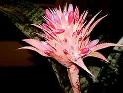 Rosa Blütenstand einer Aechmea fasciata mit blauen Blüten (nur das grau wirkende Blatt gehört zu dieser Art)