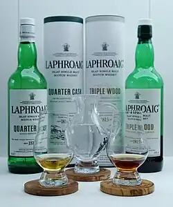 - Der Quarter Cask ist die spritzigste Variante der Laphroaigs. Er ist die schärfste und torfigste mit der niedrigsten Komplexität der drei gängigen Varianten. Im Geschmack mit viel Torf, Salz, Süße und Holz, intensiverer typischer Laphroaig-Geschmack. Der Ausbau findet „double matured“ zuerst in Eichenfässern, danach in kleinen, „Quarter Cask“ genannten Fässern statt. Der Ausbau in den Quarter Casks erfordert wegen des größeren Kontakts zur Fasswand eine geringere Reifezeit. So kann die Destillerie einer kurzfristig gestiegenen Nachfrage begegnen.