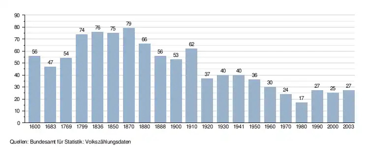 - ↑ Daten der Eidgenössischen Volkszählungen ab 1850 nach Gemeinden. (XLSX; 10 MB) Bundesamt für Statistik, Neuchâtel, 12. Juli 2024, abgerufen am 14. April 2025 (Öffnung in Excel nur über "Anhang/Excel-Datensatz" möglich).