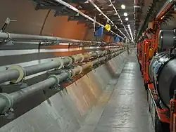 Der limitierende Faktor für die erreichbare Energie ist die Feldstärke der Magnete, die für die Ablenkung sorgen. Um weniger starke Richtungsänderungen bewirken zu müssen, wären weniger gerade Sektionen und stattdessen längere, schwächer gekrümmte Bogensektionen im Ring besser gewesen. Aus Kostengründen wurde jedoch auf einen Tunnelumbau verzichtet. Die hochenergetischen Teilchen werden im LHC durch 1232 supraleitende Dipolmagnete aus Niob und Titan auf ihrer Bahn gehalten, die mittels Stromstärken von 11.850 Ampere eine magnetische Flussdichte von bis zu 8,33 Tesla erzeugen.[3] Die Stärke des Magnetfeldes in den Dipolen und die Frequenz des elektrischen Feldes in den beschleunigenden Hohlraumresonatoren werden ständig der steigenden Energie der Teilchen angepasst. Um die Teilchenstrahlen fokussiert zu halten und um die Kollisionsrate bei der Kreuzung der beiden Strahlen zu erhöhen, kommen 392 ebenfalls supraleitende Quadrupolmagnete zum Einsatz. Die Magnete werden in zwei Schritten auf ihre Betriebstemperatur von 1,9 Kelvin (−271,25 °C) heruntergekühlt, nahe dem absoluten Nullpunkt. Im ersten Schritt werden sie mit 10.080 Tonnen flüssigem Stickstoff auf 80 K (−193,2 °C) vorgekühlt, im zweiten Schritt mittels 100 Tonnen flüssigen Heliums auf ihre Endtemperatur gebracht.[35][36] Um die Magnete auf ihrer Betriebstemperatur zu halten, sind sie ständig von etwa 60 Tonnen flüssigem Helium im suprafluiden Zustand umgeben. In diesem Zustand hat Helium eine besonders gute Wärmeleitfähigkeit. Insgesamt werden am LHC 140 Tonnen Helium für Kühlzwecke bevorratet.[37] Der LHC ist daher der größte Kryostat, der bis jetzt gebaut wurde (Stand: 2018).[38][39][40]