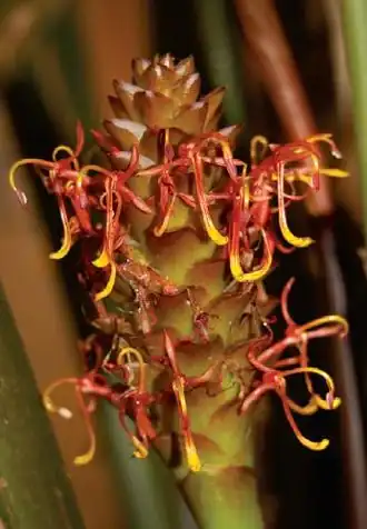 Der gestielte Blütenstand wird als wickeliger Thyrsus an der Spitze von blattlosen Trieben gebildet und kann eine Gesamtlänge von bis zu 33 Zentimetern erreichen. Der unbehaarte Stiel wird bis zu 20 Zentimeter lang und 1 bis 1,5 Zentimeter dick. Er wird von Blattscheiden umschlossen, wobei die unteren rot und die oberen grün gefärbt sind. Der eiförmig geformte Blütenstand wird 6 bis 10 Zentimeter lang und 4 bis 5 Zentimeter breit. Er hat bis zu 40 Tragblätter, wobei die untersten ein bis zwei steril sind. Diese sind hellgrün gefärbt und haben eine rötliche Spitze werden rund 3,7 Zentimeter lang und etwa 2,4 Zentimetern breit. Jedes Tragblatt trägt drei bis vier auffällige Einzelblüten. Die nicht röhrenförmigen Vorblätter werden etwa 2,1 Zentimeter lang und rund 1,6 Zentimeter breit und sind blassweiß gefärbt und haben eine rötliche Spitze.[1]