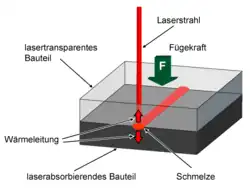 Der transparente Fügepartner wird vom Laserstrahl ohne nennenswerte Erwärmung durchstrahlt. Erst im zweiten Fügepartner wird der Laserstrahl in einer oberflächennahen Schicht vollständig absorbiert, wobei die Laserenergie in Wärmeenergie umgewandelt und der Kunststoff aufgeschmolzen wird. Aufgrund von Wärmeleitungsprozessen wird auch das transparente Bauteil im Bereich der Fügezone plastifiziert. Durch den von außen aufgebrachten sowie durch den aus der Ausdehnung der Kunststoffschmelze resultierenden inneren Fügedruck kommt es zu einer stoffschlüssigen Verbindung der Bauteile. Übliche, bei diesem Fügeverfahren eingesetzte Laserquellen sind Hochleistungsdiodenlaser (HDL, λ = 900–1100 nm) und Festkörperlaser (Faserlaser, Nd:YAG-Laser, λ = 1060–1090 nm), da nahezu alle naturfarbenen und unverstärkten Thermoplaste in diesem Wellenlängenbereich einen hohen Transmissionsgrad aufweisen. Somit ist die Hauptbedingung an die optischen Eigenschaften des transparenten Fügepartners erfüllt. Dem absorbierenden Fügepartner werden absorbierende Pigmente zugesetzt, bei denen es sich meist um Rußpigmentierungen handelt, woraus die für das menschliche Auge schwarze Farbe dieser Bauteile resultiert. Es existieren jedoch auch so genannte Infrarotabsorber, die im sichtbaren Wellenlängenbereich eine nicht schwarze Farbe aufweisen können. Darüber hinaus werden aktuell verschiedene Ansätze zum Schweißen transparenter Bauteile mittels Laserstrahlung intensiv untersucht.
