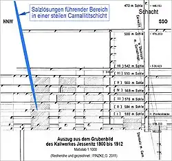 - ↑ Ersaufen: Bergmännischer Ausdruck für das teilweise oder vollständige Volllaufen einer Schachtanlage durch Eindringen von Wasser bzw. Salzlösungen.