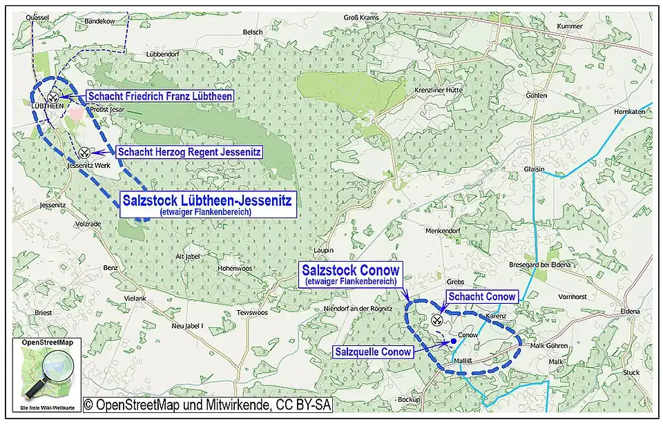 Der Salzstock Conow misst im 500-Meter-Teufenbereich etwa 21,125 km2.[12] Die Flanken des Salzstockes sind recht unterschiedlich ausgebildet.[13] Das Entstehungsalter dieser Salinarstruktur dürfte sich mit dem des Salzstockes Lübtheen-Jessenitz decken. Der Salzspiegel liegt bei −115 m NN.