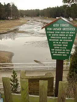 Das größte Dammbauprojekt war der Großteichdamm. Er ist 250 m lang und 12 m hoch, der Wasserstand des Großteiches konnte bis in eine Höhe von 7 m reguliert werden. Der Staudamm ist an der Krone 10 bis 18 m und an der Sohle 45 m breit. Der durch ihn aufgestaute Großteich, der am Nordrand des ehemaligen Hermsdorfer Rittergutswalds liegt und der oberste der Lausaer Teiche ist, war bereits in den Aufzeichnungen des Heidekartographen Matthias Oeder von 1589 vermerkt und erreichte eine Fläche von bis zu 65 ha, wobei 50 ha normal waren.[11] Seine historische südliche Uferlinie lebt in etwa im Verlauf der Gemarkungsgrenze zwischen der Dresdner Heide und Lausa fort. Als der Teich in seinem früheren Ausmaß noch existierte, war dies die Grenze des landesherrlichen Eigentums zum Rittergut Hermsdorf, woran ein noch vorhandener Grenzstein mit der Aufschrift „R. H.“ erinnert.