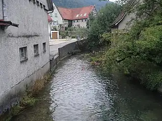 - Stadtgraben, von rechts und Nordosten auf unter 365 m ü. NHN in Owen, 1,1 km und ca. 0,6 km².[LUBW 6] Entsteht auf unter 500 m ü. NHN unter der Burg Teck.