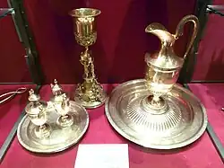 In der heiligen Messe kommen Kännchen aus Metall oder Glas zum Einsatz, aus denen Wasser über die Hände des Zelebranten oder des Diakons gegossen und mit einem dazu passenden Tablett aufgefangen wird.