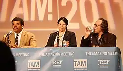 Lawrence Krauss (rechts) zusammen mit Neil deGrasse Tyson und Pamela Gay