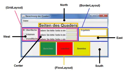 Beispielsweise würde man ein Panel (Container für GUI-Komponenten) im NORTH-Bereich mit einem FlowLayout anlegen, um dort gegebenenfalls Symbolleisten-Schaltflächen anzulegen. Im SOUTH-Bereich legt man ein Panel an (ebenfalls mit einem FlowLayout, aber mit rechtsbündiger Ausrichtung), um zum Beispiel ein OK- und Abbrechen-Schaltfläche anzulegen. Den CENTER-Bereich nutzt man mit einem Panel mit GridBagLayout für Eingabe-Elemente. Die Bereiche WEST und EAST könnte man unbesetzt lassen. Der LayoutManager würde die Komponente im CENTER-Bereich nach rechts und links bis zum Rand ausdehnen lassen.