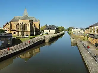 ![]() Kirche Saint-Jacques und Canal des Ardennes in Le Chesne | ||