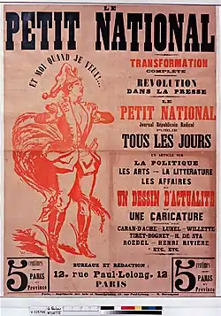 Im Dezember 1896 wurde die Leitung von André Vervoort[16] übernommen, die Tageszeitung erhielt den Untertitel „journal du soir, politique, littéraire et artistique“, bevor sie einen Monat später erneut in „journal du soir républicain progressiste“ geändert wurde.[17] Am 16. Mai 1897 wurde die Leitung von Eugène Paul-Émile (eigentlich Eugène-Paul-Émile Penaud) übernommen und der Preis pro Ausgabe auf 5 Centimes gesenkt.[18] Die Tageszeitung beanspruchte für sich, „die älteste der republikanischen Tageszeitungen“ zu sein. Sie bezeichnete sich als „Organ der progressiven Republikaner“ und der Dezentralisierung, mit Adrien Duvand[19] als Chefredakteur. Am 21. Oktober 1902 verließ Eugène Paul-Émile Le National und Le Petit National, um Le Grand National[20] zu gründen, und wurde dann in eine schmutzige Sittenaffäre verwickelt.[21]
