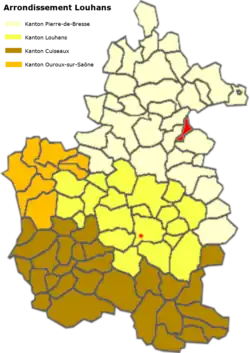 Die Gemeinde liegt in der Landschaft Bresse, im nördlichen Drittel des Arrondissement Louhans und grenzt im Nordosten an das Département Jura. Die gesamte Westgrenze wird durch die Brenne[2] gebildet, von Osten her mündet im Norden la Darge[3] von Chapelle-Voland in die Brenne. Das Tal der Brenne ist für die Gemeinde prägend, bei Hochwasser sind viele Gebiete regelmäßig überschwemmt und dienen als Rückhalteflächen. Die Departementsstraße D23[4] streift lediglich das äußerste Gemeindegebiet im Osten, ohne den Ort zu erschließen. Die Gemeinde weist nur wenige bewaldete Flächen auf, östlich des Ortes findet sich eine größere Waldfläche, sonst weist das Gebiet etliche Pappelplantagen auf. Die bewohnten Gebiete beschränken sich auf drei Schwerpunkte, der Bourg liegt auf einer leichten Anhöhe über der Brenne. Zur Gemeinde gehören folgende Weiler und Fluren: le Deffait, le Haut-du-Planois, Sancenne[5].