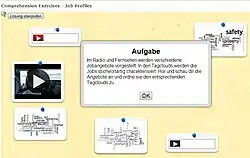 Das Autorenwerkzeug erlaubt die Nutzung und Mischung verschiedener Multimedia-Formate. Im Fremdsprachenunterricht sind Comprehension Exercises möglich. Ein Beispiel: Die Lernenden müssen kurzen Radio- und Fernseh-Sequenzen über Berufsbilder Tagclouds zuordnen, welche stichwortartig diese Berufe beschreiben. Die Schwierigkeit besteht darin, sich zunächst die Gesprächssequenzen anzuhören, sich die Inhalte der Gespräche zu vergegenwärtigen und anschließend die inhaltlich passenden Tagclouds zu identifizieren. Im Unterschied zu Zuordnungsaufgaben mit Bildern und Texten stellt dieses Aufgabenformat höhere kognitive Anforderungen an die Lernenden.
