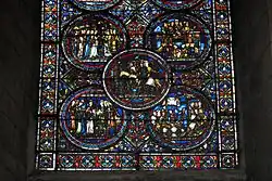 Insgesamt sind 13 Medaillons zu sehen, unterteilt in zweimal vier Medaillons, in deren Mitte jeweils ein fünftes in Kreuzform aufliegt. Darüber schließen die zwei oberen Medaillons die Erzählung ab. In der Mitte oben ist der segnende Christus dargestellt. In mittelalterlichen Fenstern wird von unten nach oben dargestellt.