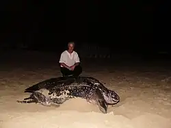 Die Lederschildkröte (Dermochelys coriacea) ist die größte lebende Schildkröte und wird meistens als einzige rezente Angehörige der gleichnamigen Familie (Dermochelyidae) angesehen. Sie zählt somit zoologisch nicht zur Familie der Meeresschildkröten (Cheloniidae), wird aber zusammen mit diesen in die Überfamilie Chelonioidea vereint, die im Deutschen manchmal ebenfalls als Meeresschildkröten bezeichnet wird.[1] Ihr Lebensraum sind tropische und subtropische Meere. Es werden für diese Art bislang keine Unterarten unterschieden.