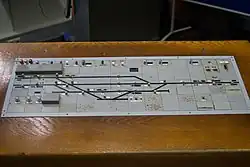 Über die gesamte Länge aller Stellwerke hinweg gibt es eine Art Streckenband, ähnlich wie bei einem Spurplanstellwerk, auf dem Gleise, Signale, Weichen, Zugeinwirkungsstellen, Stellwerke und sonstige wichtige Einrichtungen dargestellt sind. An der alten Anlage sind die Gleise durch eine Rille dargestellt, in der kleine blecherne Lokomotiven mittels dreier Kupferstifte gehalten werden. Die Kupferstifte dienen dazu, den Zug im Gleis zu halten und im Hintergrund bei Fahrt Kontakte auszulösen, die technisch auf das Stellwerk einwirken (z. B. Fahrstraßenauflösung). Die Züge sind an Stäben angebracht und werden von Hand bewegt. Die Weichen und Signale bewegen sich mithilfe von Elektromagneten, die mit der Hebelbank des Stellwerks schaltungstechnisch verbunden sind.