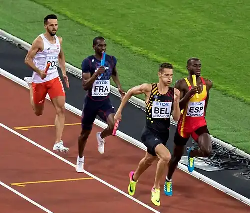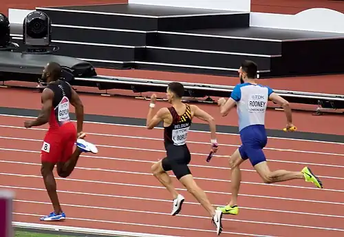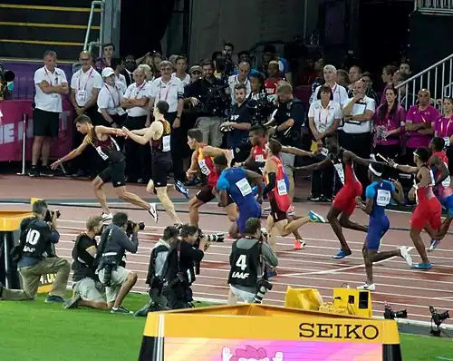 Wilbert London III, Startläufer der USA, brachte sein Team zum ersten Wechsel hin zunächst mit ein paar Metern Vorsprung an die Spitze. Im Verfolgerfeld mit Großbritannien, Belgien, Trinidad und Tobago, Spanien, Frankreich und Polen ging es sehr eng zu. Auch nach dem zweiten Wechsel blieb die US-Mannschaft mit ein paar Metern Vorsprung vorn. Dahinter lieferten sich nun Machel Cedenio für Trinidad und Tobago und der Brite Rabah Yousif ein Duell um den zweiten Platz. Belgien, Spanien, Frankreich und Polen folgten schon mit mehr als zehn Metern Rückstand. Auf der Zielgeraden der vorletzten Runde machte Cedenio den Rückstand auf den US-Läufer Michael Cherry fast wett, die Briten lagen etwa vier Meter zurück.