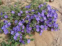Die Blüten sind zwittrig. Die blaue oder seltener ziegelrote oder weiße Blütenkrone ist bei einem Durchmesser von 15 bis 25 Millimetern radförmig.[1] Die Kronblätter sind am Rand glatt oder wenig gekerbt, mit Drüsenhaaren aus vier gleich großen Zellen.[3]