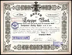 Die Leipziger Bank wurde am 5. September 1838 als Privatbank mit der Rechtsform einer Aktiengesellschaft (Stammkapital: 1,5 Millionen Taler) gegründet. Zu ihren Gründern gehörten die Leipziger Kaufleute und Bankiers Jean Marc Albert Dufour-Féronce (1798–1861), Gustav Harkort (1795–1865) und Wilhelm Seyfferth (1807–1881). Die Bank hatte seit 1864 ihren Sitz in der Klostergasse 3 (alte Hausnummer: Klostergasse 16) und unterhielt Filialen in Chemnitz und Dresden. Bis zum Jahr 1876 war die Leipziger Bank ausschließlich eine Notenbank.[2] Sie verzichtete dann aber auf das Recht zur Ausgabe von Banknoten.