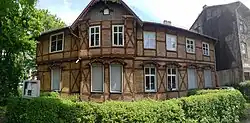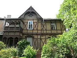 Die straßenseitige Fassade des siebenachsigen Baus verfügt über einen zweiachsigen Risalit. Der flache Risalit wird von einem verschalten Giebel bekrönt. Am Dachvorstand befinden sich Dekupierarbeiten. Ähnliche Giebel befinden sich auch auf der Rückseite des Hauses und an der nördlichen Fassade. Die rechteckigen Fenster im Erdgeschoss sind jeweils mit kleinen hölzernen Giebeln versehen. Das Obergeschoss kragt etwas über das Erdgeschoss vor. Auf der straßenabgewandten Seite befindet sich eine überdachte kleine Veranda, die mit einem wintergartenähnlichen Überbau versehen ist. Bedeckt ist das Gebäude von einem Walmdach.
