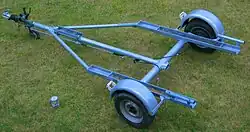 Eine Besonderheit der Leisure 17 in der Kimmkielversion ist der überwiegend verwendete, auffällig kleine Trailer, auf dem das Boot rückwärts, Heck an Heck mit dem Zugfahrzeug auf den beiden Kielen und der Kielhacke steht.