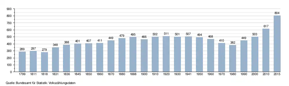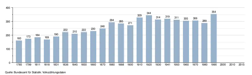 - ↑ a b Daten der Eidgenössischen Volkszählungen ab 1850 nach Gemeinden. (XLSX; 10 MB) Bundesamt für Statistik, Neuchâtel, 12. Juli 2024, abgerufen am 16. September 2025 (Öffnung in Excel nur über "Anhang/Excel-Datensatz" möglich).
