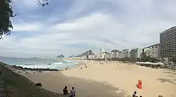 Die gepflasterte Strandpromenade, genannt Calçadão, entstand bis 1919 beim Bau der Avenida Atlântica (1906) im Stil eines europäischen Strandboulevards durch portugiesische Ingenieure. Nach dem Vorbild der Calçada Portuguesa auf dem Rossio in Lissabon entwarfen sie ein sich symbolisch auf das Meer beziehendes Wellenmuster aus weißem Kalkstein und schwarzem Basalt. Nach einer Ufervorschiebung („alargamento“) Ende der 1960er Jahre, die nach einem technischen Plan von Hildebrando de Araujo Góes Filho († 2021) die Entwässerung und den Hochwasserschutz verbesserte sowie Raum für einen breiteren Strand und eine Verbreiterung des Straßenprofils der Avenida Atlântica schuf, modernisierte der Landschaftsarchitekt Roberto Burle Marx Anfang der 1970er Jahre den neuen Stadtraum einschließlich der Promenade nach einem einheitlichen Entwurf. Seiner Komposition wurden 1985 die signifikanten Kokospalmenhaine hinzugefügt. Das beibehaltene Wellenmuster – nunmehr längs verlegt – avancierte zu einer Medienikone und zu einer Marke Rio de Janeiros. Es ist als Symbol auf vielen Produkten zu sehen, bildet ein immer wieder auftauchendes Erkennungszeichen im touristischen Marketing und repräsentiert die Corporate Identity der Stadt und ihrer Einwohner, der Cariocas.[20] 1991 wurde der Calçadão von dem Instituto Estadual do Patrimônio Cultural zum Kulturerbe erklärt.[21]