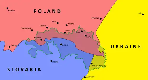 - ↑ Zugleich folgt dieser Linie auch in großen Zügen die freilich wenig scharfe Sprachgrenze zwischen Slowaken und Polen einerseits, Ruthenen oder Ukrainern anderseits, die an der Ostgrenze dieses Mittelstückes, an den Quellen der Theiß, von den Rumänen abgelöst werden. Die Dukla-Linie dient aber in gewissem Sinne auch als sekundäre Kulturgrenze. In: Landeskunde der Sudeten- und Westkarpatenländer von Fritz Machatschek 1927.