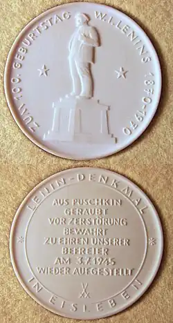 Das 3,20 Meter hohe und 2,9 Tonnen schwere Bronzedenkmal wurde 1926 von dem russischen Bildhauer Matwei Maniser geschaffen. Es stand seit 1929 in Puschkin in der Sowjetunion[2], wurde 1943 jedoch von deutschen Truppen demontiert und sollte in der Mansfelder Krughütte bei Eisleben eingeschmolzen werden. Aus ungeklärten Gründen überdauerte die Statue den Krieg.[3] Die Sowjetunion schenkte der Lutherstadt Eisleben die Statue in einer offiziellen Zeremonie im Beisein von Walter Ulbricht am 1. Mai 1948.[3] Die DEFA-Wochenschau Der Augenzeuge Nr. 104/48 (14. Mai 1948; Filmlänge 21 Meter) dokumentiert die Aufstellung des Lenindenkmals im Mai 1948 in Eisleben.[1]