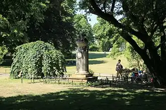 - Gellertdenkmal: Das 1909 im Park aufgestellte Denkmal für den Dichter Christian Fürchtegott Gellert (1715–1769) ist eine Nachbildung des 1774 nach einem Entwurf des Malers und Bildhauers Adam Friedrich Oeser (1717–1799) entstandenen Originals. Das Denkmal wurde neu modelliert vom Leipziger Bildhauer Max Lange (1868–1947) und ausgeführt vom Bildhauer August Louis Schmiemann und Steinmetzmeister Carl Laux.[1]