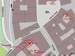Die genaue Positionierung des spätantiken Militärkomplexes anhand der wenigen vorliegenden Befunde ist schwierig, wahrscheinlich lag er in der Nähe der Martinskirche. Zwischen dem sogenannten „Kastellgraben“ und einem östlich der Martinskirche verlaufenden weiteren Graben besteht außerdem ein Höhenunterschied von fast zehn Metern, der einen funktionellen Zusammenhang dieser beiden Grabenabschnitte als problematisch erscheinen lässt. Zusätzlich stellt sich die Frage, warum der Kastellgraben auf der Schlossterrasse schon in der Spätantike wieder eingeebnet wurde.[16]