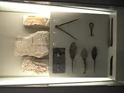 Ein weiteres Gräberfeld stammt aus dem letzten Drittel des 4. Jahrhunderts und war bis in die 530er Jahre belegt. Es liegt etwa 150 Meter von der Martinskirche (Tiefer Graben und Flügelhofgasse) entfernt und ermöglichte den Wissenschaftlern einen guten Einblick in die spätantiken Bestattungsriten. Fünf von insgesamt 37 der hier begrabenen Toten waren Gürtel mit Beschlägen beigelegt worden, die für höhergestellte Angehörige des spätrömischen Heeres als Rangabzeichen dienten. Sie sind in dieser Dichte noch in keinem anderen bekannt gewordenen römischen Gräberfeld aufgetreten. Möglicherweise handelt es sich hierbei um Bestattungen höherer Heeresangehöriger im spätantiken Lentia. Ein weiteres spätantikes (4. bis frühes 5. Jahrhundert), erheblich kleineres Gräberfeld lag auf dem Römerberg. Es handelte sich um Gräber einer sozial abgestuften Bevölkerung, die bis zur Mitte des 5. Jahrhunderts am Schlossberg siedelte.[30] Die Bestattungen zwischen dem Tiefen Graben und der Schlüsselhofgasse waren insbesondere für die Anthropologen aufschlussreich, da anhand der Knochen pathologische Befunde gemacht werden konnten (Kinderlähmung, Knochenkrebs), die Rückschlüsse auf die Lebensbedingungen der Bewohner jener Zeit ermöglichten.[31]