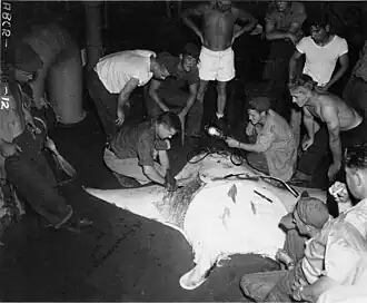 Schultz (kniend, links), umringt von Matrosen der USS „Chilton“, bei der Untersuchung eines Riesenmantas.