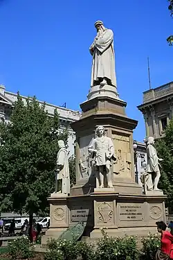 Im Jahr 1858 wurde der Bildhauer Pietro Magni mit der Schaffung eines Denkmals für Leonardo da Vinci beauftragt. Aufgrund politischer Unruhen (Zweiter italienischer Unabhängigkeitskrieg (1859)) und Problemen bezüglich der Finanzierung des Projekts wurde das Denkmal erst 1872 fertiggestellt. Es wurde schließlich am 4. September 1872 auf der Piazza della Scala vor dem Teatro alla Scala eingeweiht.[2]