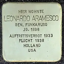 Am 18. März 2019 wurde vor dem ehemaligen Wohnhaus Weißhausstraße 25 vom Künstler Gunter Demnig ein Stolperstein zum Gedenken an Leonardo Aramesco verlegt.