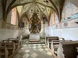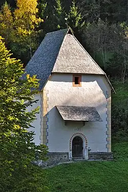 Die Kapelle ist über dem abgefasten Westportal mit 1528 datiert. Neben dem Portal befindet sich ein gotisches Weihwasserbecken aus dem 16. Jahrhundert. Die Fassade weist eine gemalte Eckquaderung und ein gemaltes Schmuckfries unter der Dachtraufe auf. Über dem einjochigen Kapellenraum mit Fünfachtelschluss und drei spitzbogigen Fenstern erhebt sich ein Netzrippengewölbe.