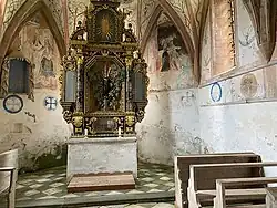 Der mit Knorpelwerk dekorierte Altar von 1668 trägt eine Figur des heiligen Leonhard vom Anfang des 16. Jahrhunderts. Die ehemaligen Seitenfiguren des heiligen Christophorus und eines heiligen Bischofs mit einer Braun-Gold-Fassung wurden 1994/95 restauriert. Eine Votivtafel des 17. Jahrhunderts mit der Darstellung des heiligen Petrus und der Vierzehn Nothelfer wird mit dem Gurker Bischof Sigismund Franz in Verbindung gebracht.