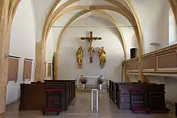 Nördlich schließt ein dreijochiges Kirchenschiff mit Kreuzrippengewölbe auf Wandpfeilern mit Emporengang an. Es ist die gotische Kirche aus dem 14. Jahrhundert, die nach schweren Kriegsschäden im Jahre 1945 zu einer Kriegergedächtnisstätte umgestaltet wurde. Davon nördlich ist noch das Untergeschoß des ehemaligen Kirchturms mit der Jahresangabe 1688 erhalten, der obere Teil des Turmes wurde im Jahre 1945 zerstört. Die Kreuzigungsgruppe mit drei Figuren im Altarraum stammt vom Südtiroler Bildhauer Veit Königer. Sie ist aus dem 18. Jahrhundert.