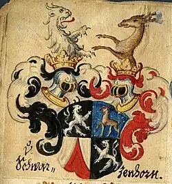 - Blasonierung des vermehrten Wappens von 1629: Geviert mit blauem Herzschild, darin zwei ins Andreaskreuz gestellte silberne Schlüssel mit den Bärten nach oben und außen. Felder 1 und 4 in Schwarz ein nach innen gekehrter silberner Löwe, Feld 2 in Blau ein natürlicher Rehbock, Feld 3 in Silber eine eingeschweifte rote Spitze. Zwei gekrönte Helme: I. mit schwarz-silbernen Helmdecken der silberne Löwe wachsend, II. mit rot-silbernen Decken der Rehbock wachsend.