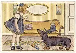 Suzanne Cocq stellte Bucheinbände und Buchmalerei in Gent aus. Die Arbeit Dackelhund und Puppe war ein Werbeplakat für Foyer des Orphelins aus dem Jahr 1916. Die Werke, die sie in ihrem späteren Leben schuf, wichen stark von diesem Stil ab. Das Bild zeigte eine Puppe, die mit einem Dackelhund kommuniziert. Zwischen den beiden lag ein Schnuller. Im Hintergrund saß eine zweite, weniger detaillierte Puppe in einem Sessel. An der tapezierten Wand hingen ein ovaler Spiegel und zwei Bilder mit bunten Motiven.